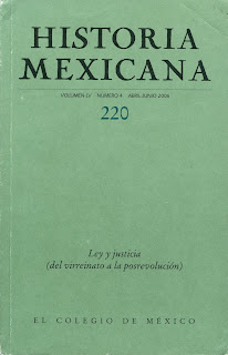 En el reciente número de la revista Historia Mexicana [HMex, LV:4 (220), abril – junio, 2006, pp. 1509-1518] se publicó mi reseña del libro de varios autores Historia de la justicia en México, siglos XIX y XX, compilación de la Dirección General del Centro de Documentación, Análisis, Archivos y Compilación de leyes, México, Suprema Corte de Justicia de la Nación, 2005, 2 Vols. ISBN 970-712-501-2. Inserto a continuación un fragmento de la reseña, invitando a leer el número de la revista dedicado al tema “Ley y justicia (del virreinato a la posrevolución).”
